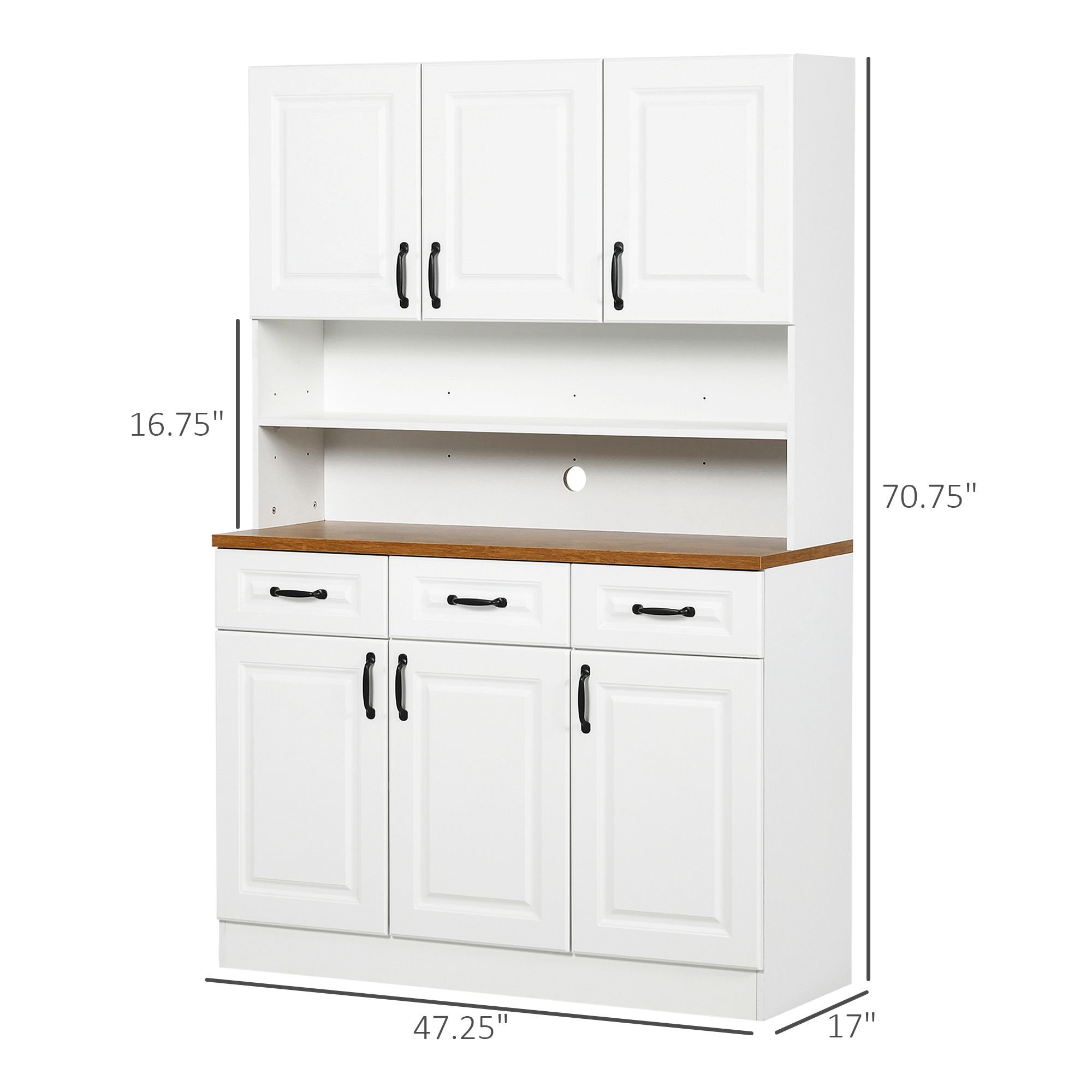 1.- Maximize Kitchen Storage: Our kitchen hutch offers six cabinets and three drawers, providing ample space for dishes, pots, pans, and silverware, making it a perfect storage solution.