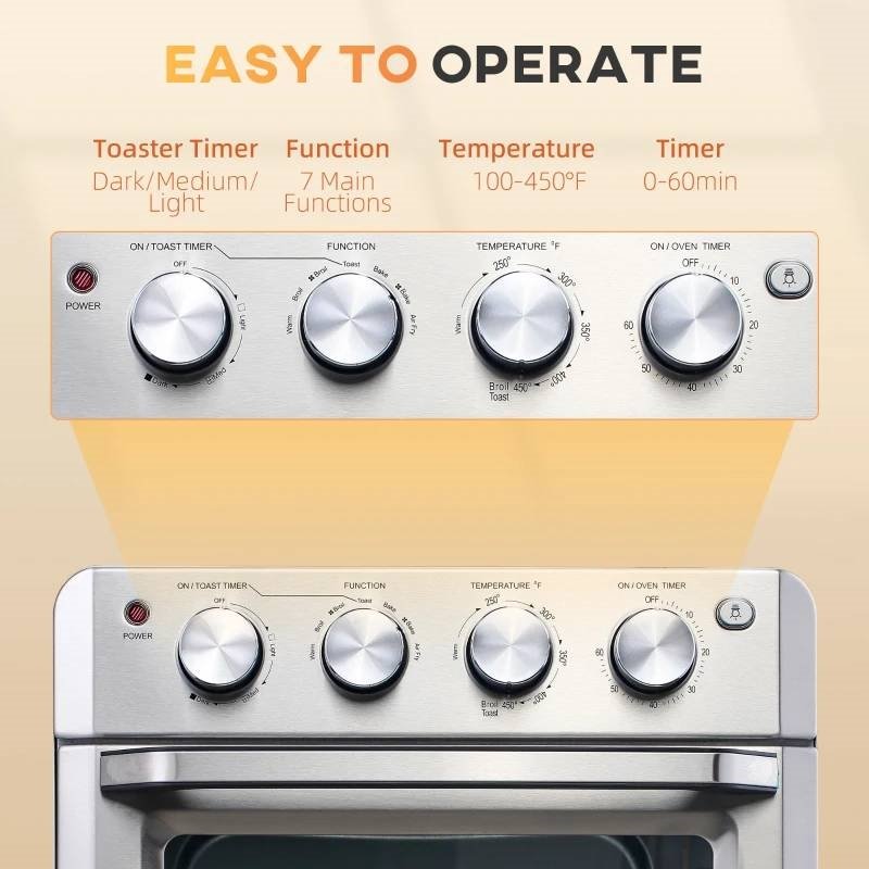 This Silver Multi-Function 7-in-1 Toaster Oven 21 QT features 7 functions - warm, broil, convection broil, toast, bake, convection bake and air fryer to meet your daily cooking needs. You can easily control the temperature of this conventional oven from 100 F - 450 F and cooking time from 0-60 minutes according to your needs. 3 toasted shade options in light, medium and dark can be selected by switching the toaster timer button. The built in light and glass viewing window allow you to observe the process and 3 rack positions let you cook different kinds of food at once in this convection oven. This 4 slice toaster oven provides ample room for 4 slices of bread or up to a 9"pizza while saving space in your kitchen. Feature 1 x fry basket, 1 x oven rack, 1 x baking pan, and 1 x crumb tray to make different delicious food